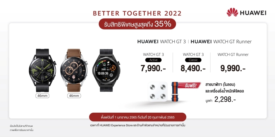 HUAWEI WATCH GT 3 Series ขนาด 46 มม. สมาร์ทวอทช์ที่ช่วยเติมเต็มเต็มไลฟ์สไตล์ของคนที่ต้องการดูแลสุขภาพได้อย่างรอบด้าน จัดเต็มด้วยอายุการใช้งานแบตเตอรี่ยาวนานถึง 14 วัน พร้อมความสามารถในการตรวจวัดค่าทางสุขภาพ และฟีเจอร์จัดสรรการออกกำลังกายอัจฉริยะ มีให้เลือก 3 แบบ ได้แก่ Active Edition ราคา 7,990 บาท Classic Edition ราคา 8,490 บาท และ HUAWEI WATCH GT Runner ราคา 9,990 บาท พร้อมรับฟรีสายนาฬิกาไนลอน และเครื่องชั่งน้ำหนัก HUAWEI Scale 3 รวมมูลค่าทั้งหมด 2,298 บาท