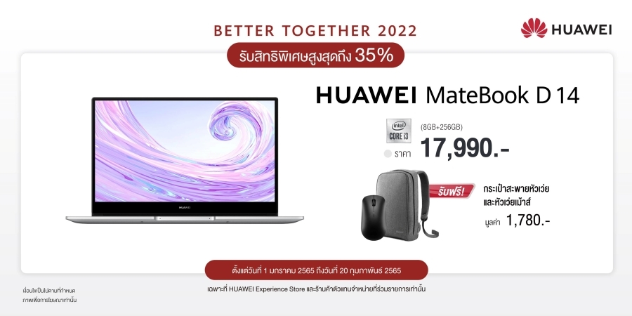 - HUAWEI MateBook D 15 (i3) 8GB+256GB ราคา 16,990 บาท พร้อมรับฟรีกระเป๋าสะพายหัวเว่ยมูลค่า 1,090 บาท