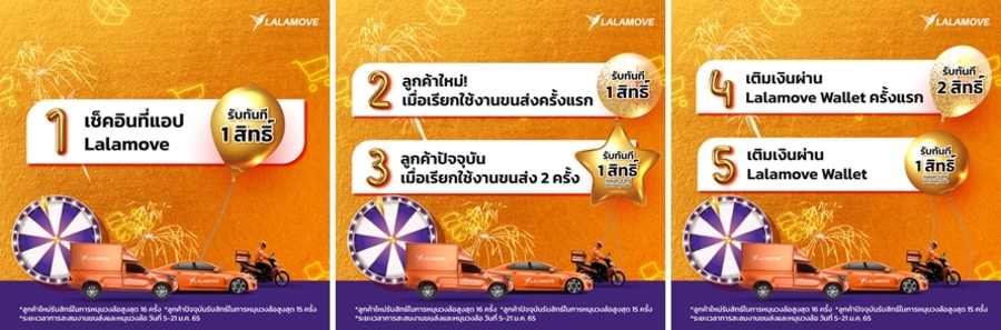 ลูกค้าสามารถเลือกใช้บริการรับ–ส่งสินค้าตามความต้องการ (on-demand delivery service) จากลาลามูฟในราคาสุดพิเศษผ่านแอปพลิเคชัน LALAMOVE หรือดาวน์โหลดได้ที่  https://bit.ly/3h0te02  พร้อมร่วมสนุกกับแคมเปญ LALA 2022 ยิ่งใช้ยิ่งมีสิทธิ์มาก! หมุนวงล้อชิงของสมนาคุณสุดพิเศษ ตั้งแต่วันที่ 5 – 21 มกราคม 2565 รายละเอียดเพิ่มเติม คลิก!