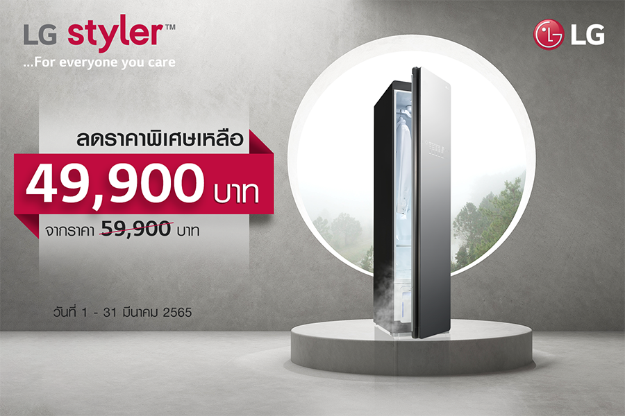 โปรโมชั่น “LG Styler… For everyone you care” มอบส่วนลดพิเศษสำหรับผลิตภัณฑ์ตู้ถนอมผ้า LG Styler (รุ่น S3MFC) จากปกติราคา 59,900 บาท เหลือ 49,900 บาท เริ่มวันที่ 1 มีนาคม ถึงวันที่ 31 มีนาคม พ.ศ. 2565 ณ ร้านค้าตัวแทนจำหน่ายของแอลจีและห้างสรรพสินค้าชั้นนำทั่วประเทศ