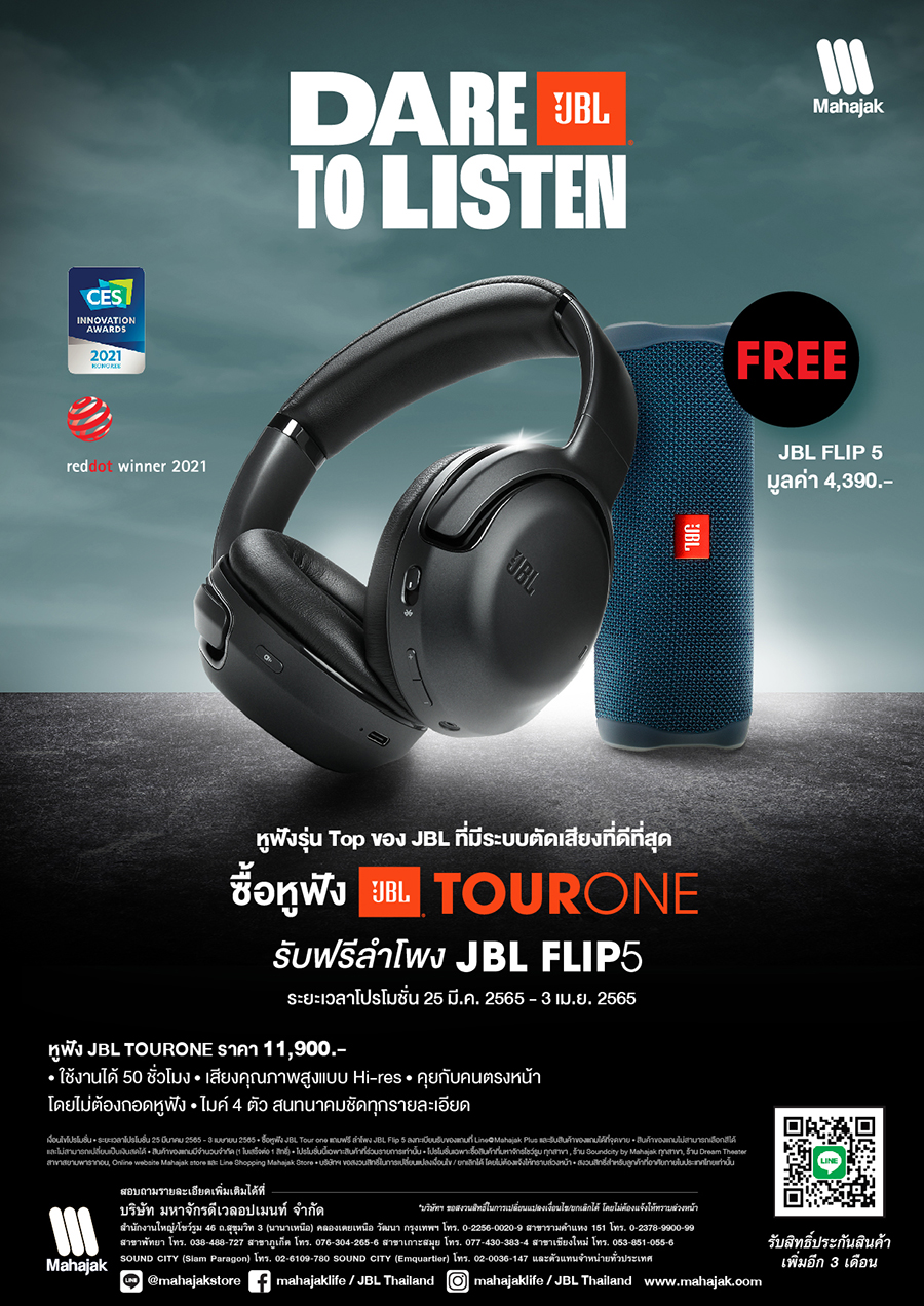 JBL TOUR ONE วางจำหน่ายแล้ววันนี้ในราคา 11,900 บาท รับฟรี! ลำโพง JBL FLIP 5 (มูลค่า 4,390 บาท) ตั้งแต่วันที่ 25 มีนาคม 2565 - 3 เมษายน 2565 นี้ สามารถซื้อได้ที่ Showroom มหาจักรฯ ทุกสาขา, ร้าน Soundcity by Mahajak ทุกสาขา, ร้าน Dream Theater สาขาสยามพารากอน, Online website Mahajak store และ Line Shopping Mahajak Store