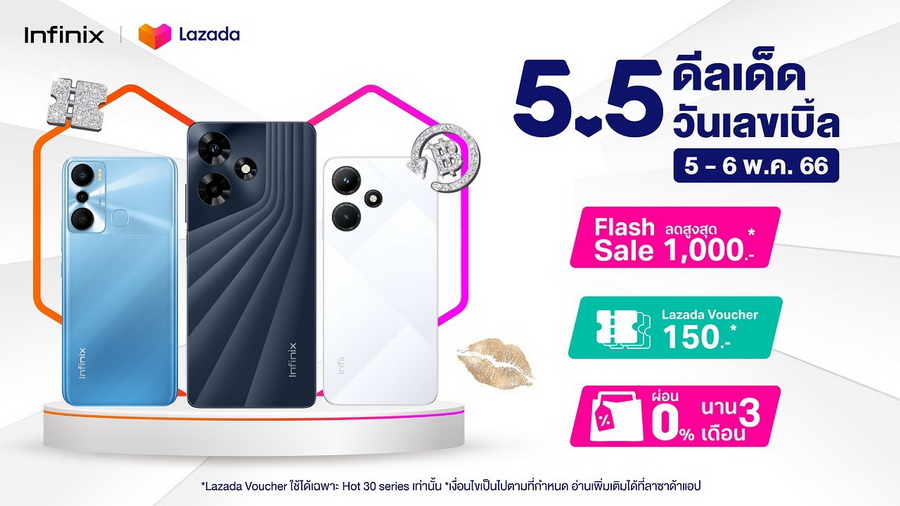 อินฟินิกซ์ (Infinix) แบรนด์สมาร์ตโฟนสายเกมราคาคุ้มค่า ครบครันทุกการใช้งาน และตอบโจทย์ไลฟ์สไตล์คนรุ่นใหม่ เสิร์ฟโปรโมชันพิเศษต้อนรับเดือน 5 ผ่านแคมเปญวันเลขเบิ้ล ให้ผู้ใช้งานและนักช้อปชาวไทยซื้อมือถือหลายรุ่นยอดนิยม อาทิ HOT 30, HOT 30i (8+128GB), HOT 30i (4+128GB), HOT 20i (4+64GB) และ SMART 7 ในราคาที่ดีที่สุด คุ้มค่ามากที่สุด ในช่วงเวลา Flash Sale ด้วยส่วนลดสูงสุด 1,000 บาท พร้อมรับข้อเสนอผ่อนสบาย 0% สูงสุดนาน 10 เดือน เมื่อซื้อสินค้าที่ร่วมรายการ โดยสามารถซื้อสินค้าได้ที่ร้าน Infinix Official Store บน Shopee, Lazada และ TikTok