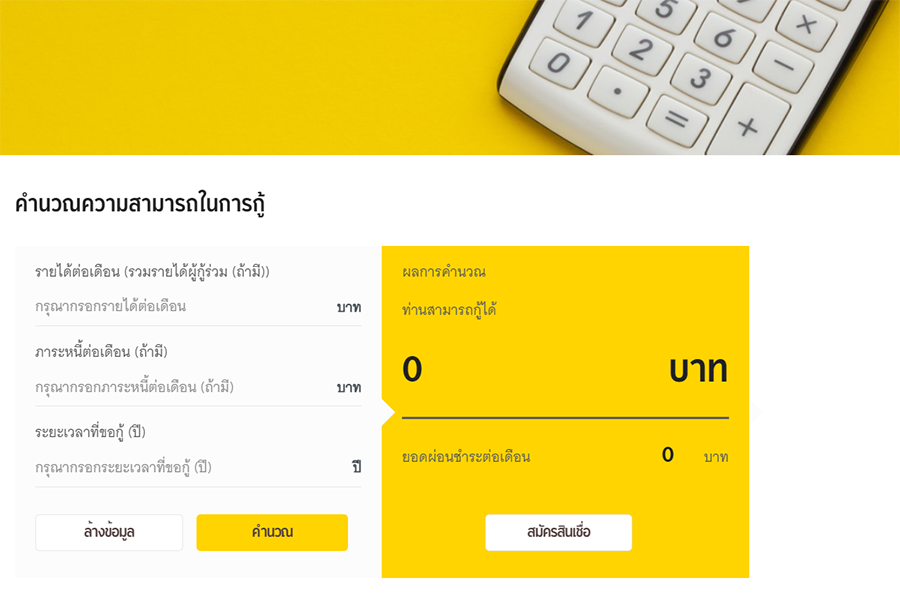 - สามารถคำนวณความสามารถในการกู้ได้ผ่านทางเว็บไซต์ของธนาคารได้ ทำให้เรารู้วงเงินที่เราน่าจะกู้ได้ และยอดผ่อนต่อเดือนในเบื้องต้น มาประกอบการตัดสินใจของเราได้ค่ะ ตัวอย่างกล่องคำนวณสินเชื่อในเว็บไซต์ของธนาคาร (ขอบคุณภาพจาก www.krungsri.com)