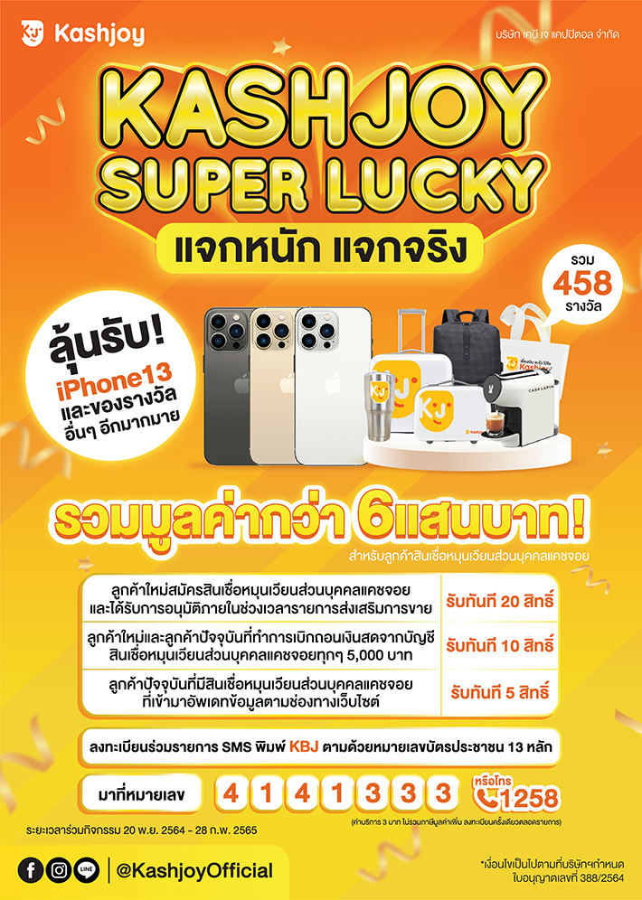 แคมเปญโปรโมชั่นพิเศษ "Kashjoy Super Lucky แจกหนักแจกจริงมากกว่า 400 รางวัล" สำหรับลูกค้าใหม่ที่สมัครบัตรกดเงินสดแคชจอย สินเชื่อหมุนเวียนส่วนบุคคลแคชจอย และได้รับการอนุมัติ และลูกค้าเก่าที่ทำการเบิกถอนเงินสดจากบัญชีสินเชื่อ รวมทั้งการเข้าไปอัปเดตข้อมูลทางเว็บไซต์ โดยจะได้รับสิทธิ์ ดังนี้