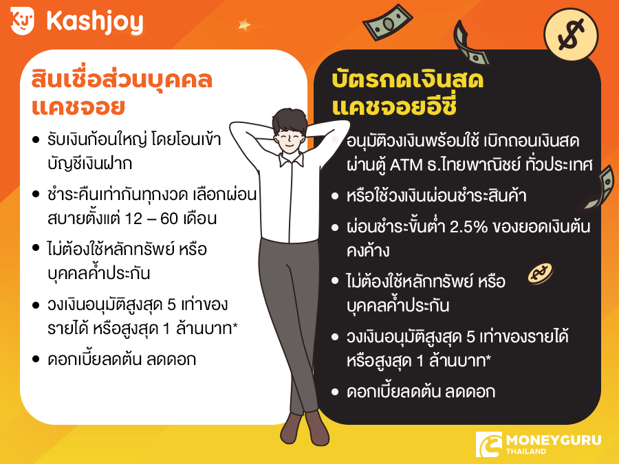 โดยเราขอสรุปความแตกต่างของสินเชื่อส่วนบุคคลแคชจอย และบัตรกดเงินสดแคชจอยอีซี่ มาให้ตามตารางด้านล่างนี้นะคะ
