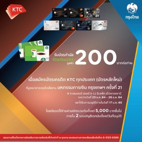 KTC : สมัครบัตรเครดิตเคทีซี รับบัตรกำนัล Starbucks มูลค่า 200 บาท (เมื่อสมัครบัตรเครดิตเคทีซีบัตรหลักใหม่ ทุกประเภท)
