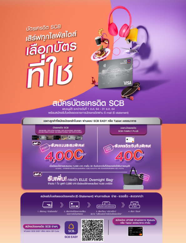 - ต่อที่ 2 : ใช้จ่ายสะสมตั้งแต่ 10,000 บาทขึ้นไป รับเพิ่ม กระเป๋า ELLE Overnight Bag 1 ใบ มูลค่า 2,890 บาท (เฉพาะบัตรเครดิต SCB UP2ME รวมช่องทางการขอผ่าน Website ของธนาคารไทยพาณิชย์)