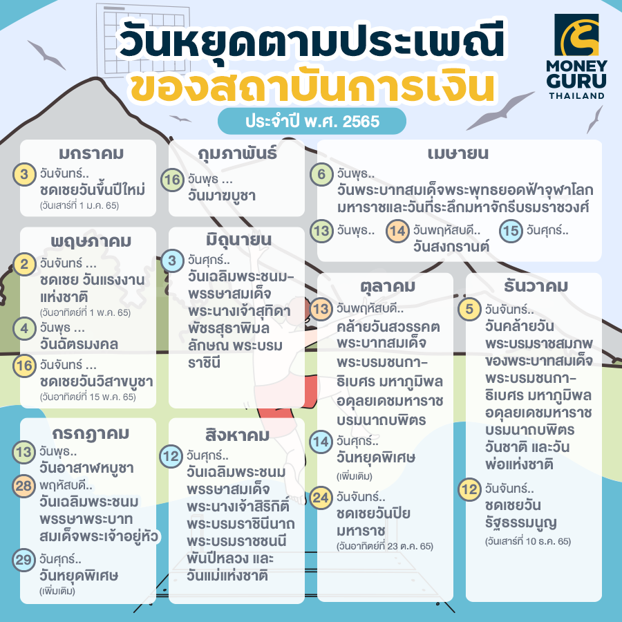 เช็กให้ชัวร์...วันหยุดตามประเพณีของสถาบันการเงิน ประจำปี พ.ศ. 2565 ตามที่ธนาคารแห่งประเทศไทยประกาศมาล่าสุด ปีนี้มีวันหยุดพิเศษเพิ่มเติม 2 วัน ดังนั้นสถาบันการเงินมีหยุดรวมทั้งหมด 19 วันค่ะ โดยถือให้เป็นวันหยุดทำธุรกรรมทางการเงินสำหรับธนาคารสาขาปกติจะปิดให้บริการ เว้นแต่ สาขาของธนาคารที่อยู่ในห้างสรรพสินค้าที่ส่วนใหญ่จะเปิดให้บริการกันทุกวัน ไม่มีวันหยุด (ทั้งนี้ จะขึ้นอยู่กับเงื่อนไขที่แต่ละธนาคารกำหนดไว้) เราลองมาดูกันค่ะ ว่ามีวันหยุดวันไหนบ้างจะได้ไม่ไปธนาคารผิดวันนะคะ และมีวันหยุดไหนที่ติดกับวันเสาร์-อาทิตย์ และเป็นวันหยุดยาวบ้าง จะได้แพลนกันยาวๆ ไปเลย