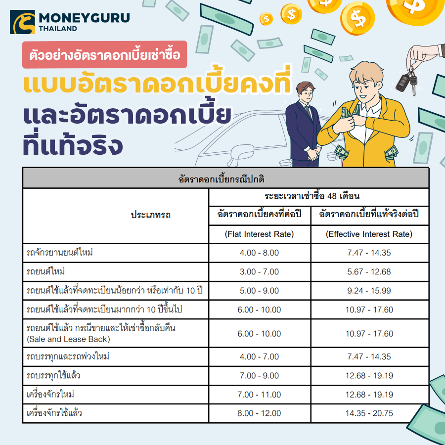 ข้อแนะนำสุดท้ายสำหรับพวกเราทุกคนที่จะซื้อขอสินเชื่อเช่าซื้อคือ ในทางปฏิบัติ ผู้ให้สินเชื่อมักจะโฆษณา หรือพูดถึงแต่อัตราดอกเบี้ยแบบเงินต้นคงที่ (Flat Interest Rate) เพราะตัวเลขจะต่ำกว่าดอกเบี้ยอัตราดอกเบี้ยลดต้นลดดอกเสมอ (Effective Interest Rate) และเราไม่สามารถนำตัวเลข Flat Rate มาเปรียบเทียบโดยตรงกับตัวเลข Effective Rate ได้ เพราะวิธีการคิดดอกเบี้ยแตกต่างกัน ดังนั้น เวลาคุยกับพนักงานขายต้องถามให้ชัดว่าอัตราดอกเบี้ยที่ให้คืออัตราแบบไหน และถ้าเค้าบอกเป็น Flat Rate และเราอยากรู้เป็น Effective Rate ให้เราเอา Flat Rate คูณด้วย 1.8 โดยประมาณครับ เราก็จะทราบว่าอัตราดอกเบี้ยจริงๆ ที่เราต้องจ่ายคือเท่าไหร่ ตัวอย่างนี้คืออัตราดอกเบี้ยของธนาคารหนึ่งในการปล่อยสินเชื่อเช่าซื้อ ซึ่งมีการพูดถึงทั้ง 2 Rate และถ้าลองเอา 1.8 คูณดู ก็จะได้ตัวเลขประมาณที่เห็นนี้ครับ