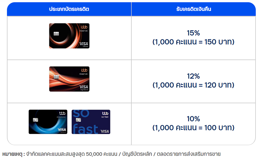 - สิทธิพิเศษเฉพาะผู้สมัครบัตรเครดิต ttb absolute หรือบัตรเครดิต ttb so fast ประเภทบัตรหลักซึ่งยังไม่เคยได้รับอนุมัติบัตรเครดิต TMB และ/หรือ บัตรเครดิต ttb ทุกประเภทมาก่อน หรือเคยได้รับอนุมัติ แต่ยกเลิกไปแล้วไม่น้อยกว่า 6 เดือน นับตั้งแต่วันที่บัตรใหม่ได้รับการอนุมัติ