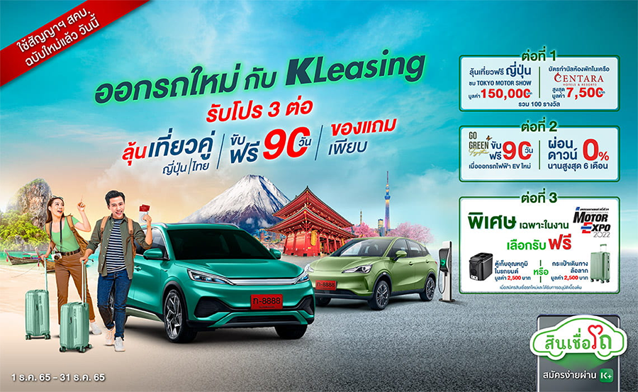 KLeasing : ออกรถใหม่กับ KLeasing ลุ้นเที่ยวฟินอินเจแปน และเที่ยวทั่วไทย รวม 100 รางวัล! และรับโปรแรง 3 ต่อเฉพาะช่วงงาน MOTOR EXPO 2022 วันที่ 1 - 31 ธ.ค. 65 เท่านั้น!