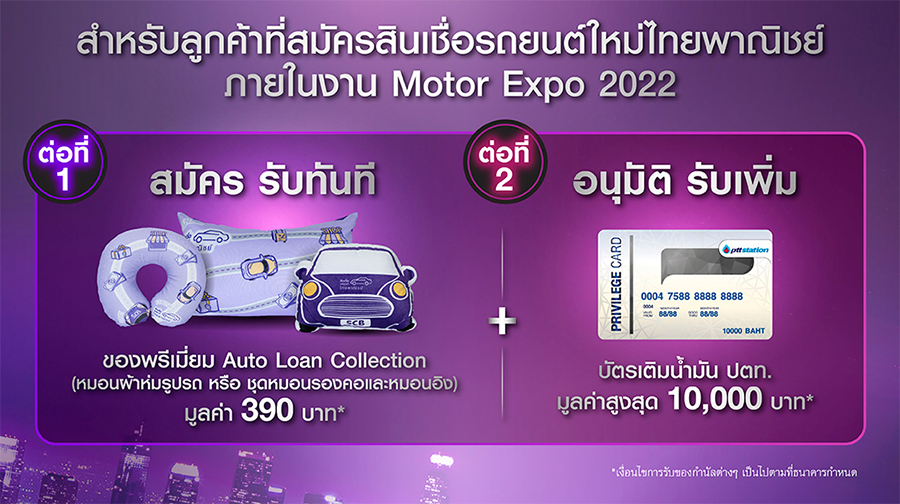 สิทธิพิเศษสำหรับลูกค้าที่จองรถยนต์ และสมัครสินเชื่อเช่าซื้อรถยนต์ใหม่กับธนาคารไทยพาณิชย์ภายในงาน Motor Expo 2022 เท่านั้น รับของสมนาคุณ 2 ต่อ