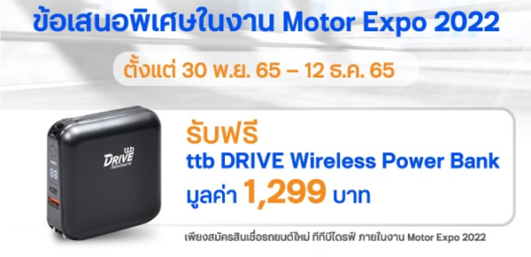 เพียงออกรถยนต์ใหม่กับสินเชื่อรถยนต์ ทีทีบีไดรฟ์ พร้อมเปิดบัญชี ttb all free สมัครและเข้าใช้งาน แอป ttb touch รับเลยโปรช่วยผ่อนค่างวดคนละครึ่งสูงสุด 10,000 บาท พร้อมรับของสมนาคุณ Wireless Power Bank มูลค่า 1,299 บาท เมื่อสมัครสินเชื่อภายในงาน Motor Expo 2022 ที่บูททีทีบีไดรฟ์