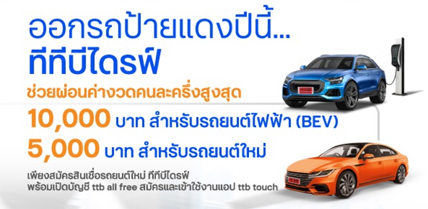 ออกรถยนต์ใหม่ กับสินเชื่อรถยนต์ ทีทีบีไดรฟ์ รับโปรช่วยผ่อนชำระค่างวดสินเชื่อรถยนต์คนละครึ่ง สูงสุด 10,000 บาท