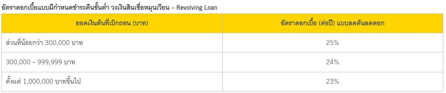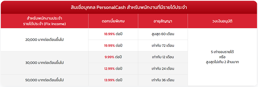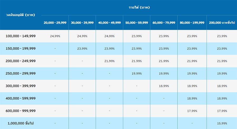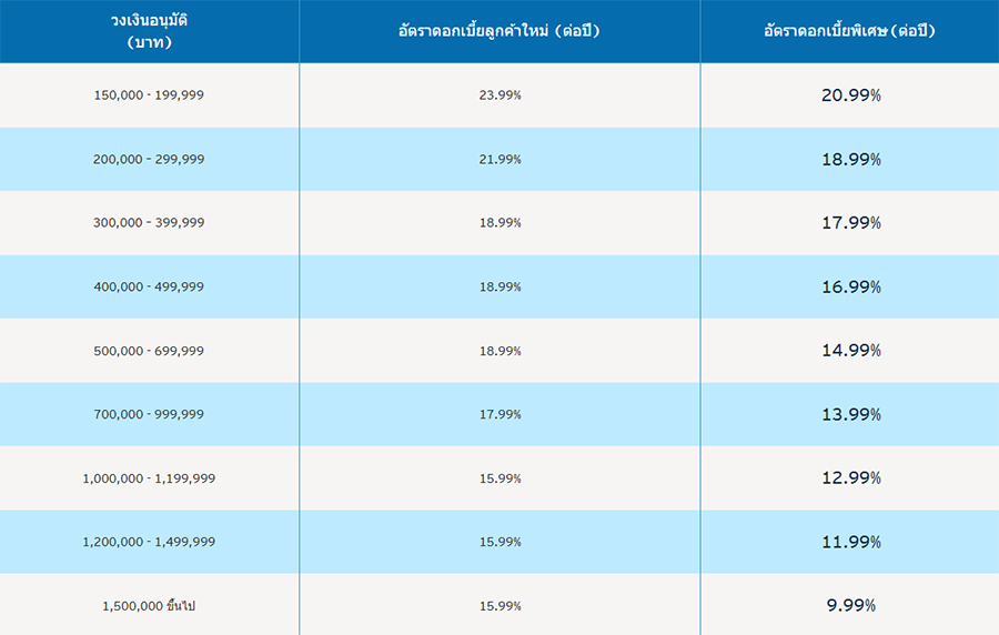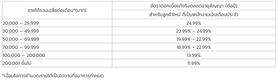- รายได้ประจำต่อเดือน 20,000 บาทขึ้นไป เลือกรับดอกเบี้ย 18.99% ต่อปี หรือ 19.99% ต่อปี