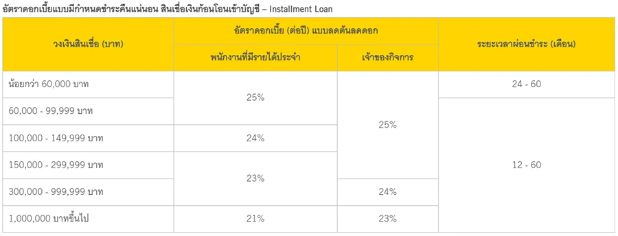 - พิเศษ ดอกเบี้ย 9.99% 2 เดือนแรก สำหรับเจ้าของกิจการ ผู้มีรายได้/เดือน ตั้งแต่ 100,000 บาทขึ้นไป (ระยะเวลาการผ่อนชำระ 1-2 ปี)