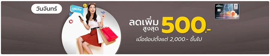 - พิเศษ ทุกวันจันทร์ : รับส่วนลดสูงสุด 500 บาท เมื่อช้อปตั้งแต่ 2,000 บาทขึ้นไป