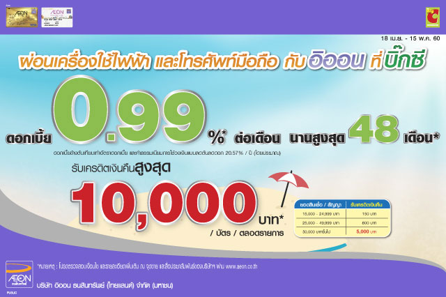 - โปรดตรวจสอบรายละเอียดเพิ่มเติม ณ จุดขาย หรือที่ www.aeon.co.th และสื่อประชาสัมพันธ์อื่นของบริษัทฯ