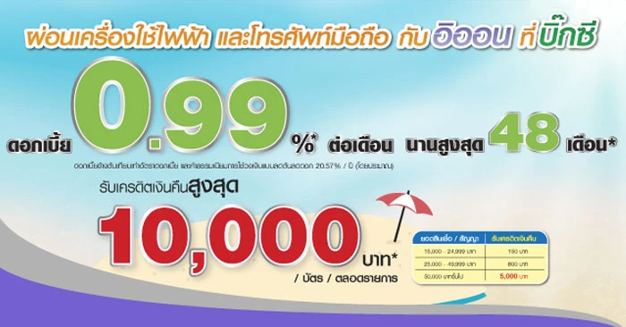 - - เมื่อมียอดผ่อนชำระค่าสินค้า เครื่องใช้ไฟฟ้า, โทรศัพท์มือถือ และ ไอที ตั้งแต่ 10,000 บาทขึ้นไป/สัญญา รับอัตราดอกเบี้ยพิเศษ 0.99% ต่อเดือน นานสูงสุด 48 เดือน สามารถตรวจสอบสินค้าที่ร่วมรายการได้ ณ จุดขาย (อัตราดอกเบี้ยพิเศษข้างต้นเทียบเท่าอัตราดอกเบี้ยและค่าธรรมเนียมการใช้วงเงินแบบลดต้นลดดอก 20.57% / ปี โดยประมาณ)