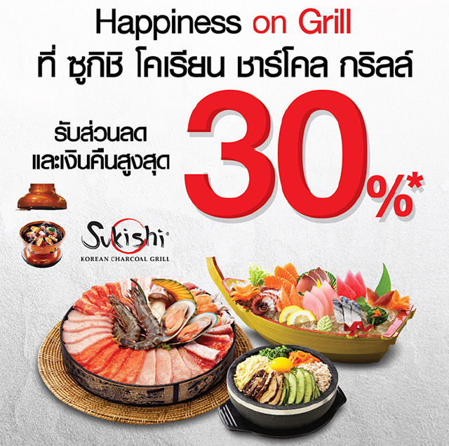 Happiness on Grill ที่ซูกิชิ โคเรียน ชาร์โคล กริลล์.. รับส่วนลดและเงินคืนสูงสุด 30% สิทธิพิเศษสำหรับบัตรเครดิต และบัตรเดบิต บีเฟิสต์ ธนาคารกรุงเทพ