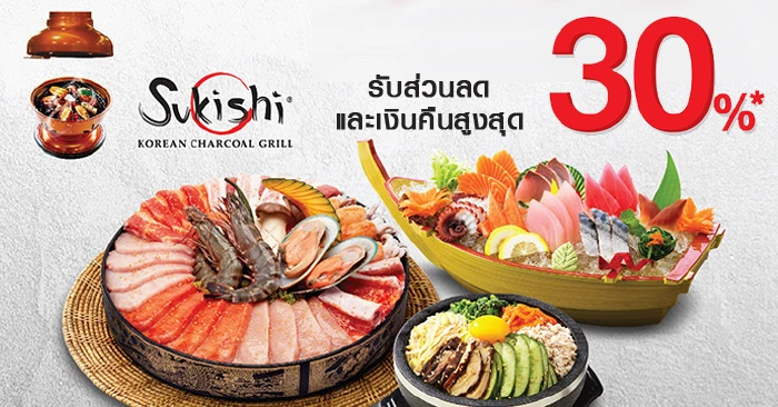 รับส่วนลด - เงินคืนสูงสุด 30% ที่ซูกิชิ โคเรียน ชาร์โคล กริลล์  เมื่อชำระผ่านบัตรเครดิตและเดบิต ธ.กรุงเทพ