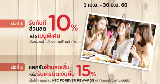 • ต่อที่ 2 แลกรับส่วนลดเพิ่ม หรือรับเครดิตเงินคืน 15% เมื่อใช้คะแนนสะสม KTC Forever Rewards เท่ากับยอดใช้จ่าย/ เซลล์สลิป
