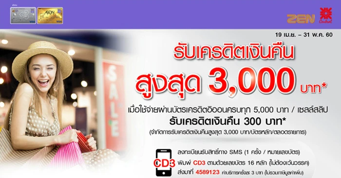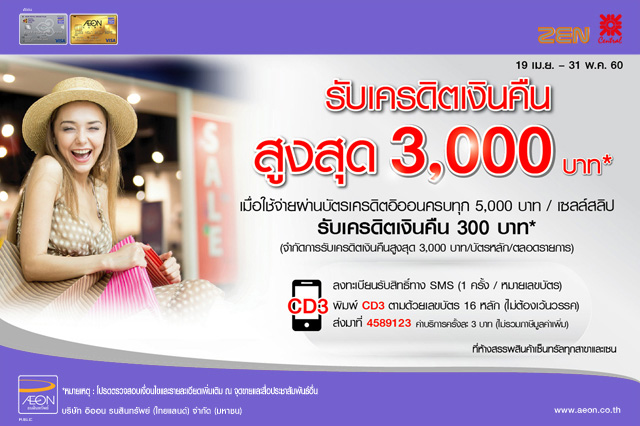 เงื่อนไขรายการส่งเสริมการขาย - สิทธิพิเศษสำหรับผู้ถือบัตรเครดิตอิออนทุกประเภทที่ออกโดยบริษัท อิออน ธนสินทรัพย์ (ไทยแลนด์) จำกัด (มหาชน) ("บริษัทฯ") ยกเว้นบัตรเครดิตเพื่อองค์กร ที่มียอดใช้จ่ายผ่านบัตรเครดิตในโซนห้างสรรพสินค้าเซ็นทรัลทุกสาขา และห้างสรรพสินค้าเซน ตั้งแต่วันที่ 19 เม.ย. - 31 พ.ค. 2560 (43 วัน)