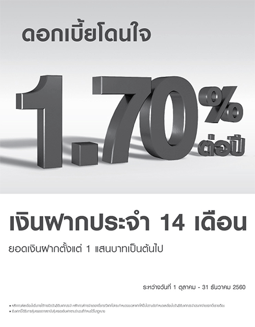 1. อัตราดอกเบี้ยพิเศษนี้สำหรับลูกค้าประเภทบุคคลธรรมดาที่มาเปิดบัญชีประเภทเงินฝากประจำ ระยะเวลาฝาก 14 เดือน ด้วยยอดเงินฝากตั้งแต่ 100,000 บาท