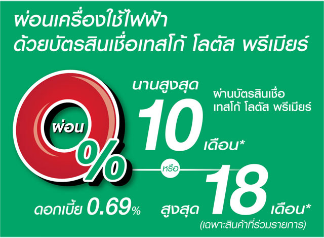 ผ่อน 0% สุดคุ้มที่เทสโก้ โลตัส นานสูงสุด 10 เดือน + รับเครดิตเงินคืน 3% - ผ่อนเครื่องใช้ไฟฟ้าและโทรศัพท์มือถือผ่านบัตรสินเชื่อเทสโก้โลตัสพรีเมียร์ 0% นานสูงสุด 10 เดือน หรืออัตราดอกเบี้ยพิเศษ 0.69% นานสูงสุด 18 เดือน เฉพาะสินค้าที่ร่วมรายการเท่านั้น