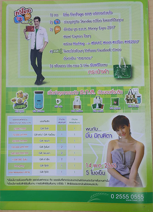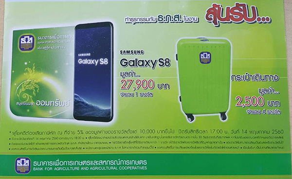 สำหรับบูธ ธ.ก.ส. ปีนี้มีว้าวนะคะ เพราะมีแจกโทรศัพท์มือถือ Sumsung Galaxy S8 มูลค่า 27,900 บาทจำนวน 1 รางวัล และกระเป๋าเดินทางมูลค่า 2,500 บาทจำนวน 4 รางวัลค่ะ ลองไปดูกันค่ะว่าทำอย่างไรถึงจะได้ครอบครอง^^