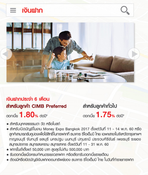 ธนาคารซีไอเอ็มบี ไทย พร้อมพาคุณก้าวข้ามอุปสรรคทางการเงิน ให้คุณก้าวไปอีกขั้น เพื่อทุกจุดหมายที่ตั้งไว้ ปีนี้ธนาคารซีไอเอ็มบี ไทย ก็ยกขบวนโปรโมชั่นมาไม่น้อยเลยที่เดียวค่ะ ลองดูกันสิคะว่าโปรโมชั่นเงินฝาก และประกันชีวิต จะมีอะไรที่คุณๆ สนใจกันบ้าง