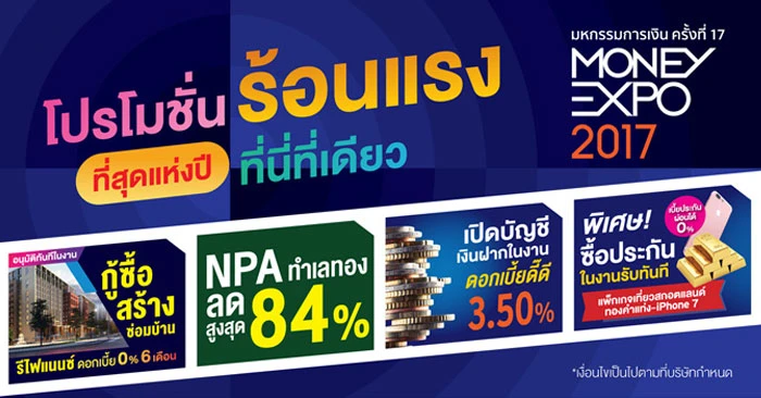 มหกรรมการเงิน ครั้งที่ 17 Money Expo 2017 ในครั้งนี้มีบริการทางการเงินและการลงทุนอย่างครบวงจรจากธนาคารและสถาบันการเงินที่เข้าร่วมงาน ซึ่งได้แข่งขันกันนำแคมเปญโปรโมชั่นพิเศษสุดในรอบปี ทั้งสิทธิประโยชน์ที่ดีที่สุด ดอกเบี้ยเงินกู้ที่ต่ำที่สุด และผลตอบแทนที่คุ้มค่าที่สุด รวมไปถึงการลุ้นรางวัลชิงโชค ของแจก ของแถมอีกมากมาย