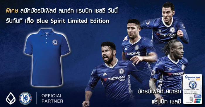 พิเศษ! สมัครบัตรวันนี้ รับทันที"เสื้อ Blue Spirit Limited Edition" ลิขสิทธิ์แท้ จากสโมสรฟุตบอลเชลซีและธนาคาร กรุงเทพ มูลค่า 2,490 บาท