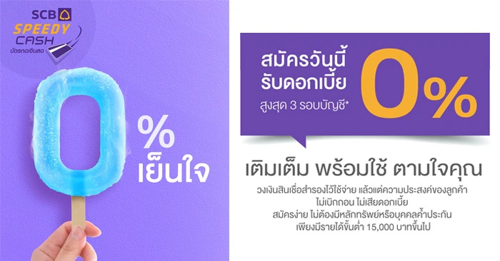 รับดอกเบี้ย 0% สูงสุด 3 รอบบัญชี เมื่อสมัคร SCB Speedy Cash ตั้งแต่วันนี้ - 30 มิ.ย. 60