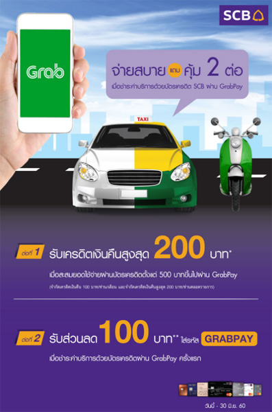 จ่ายสบาย แถมคุ้ม 2 ต่อ เมื่อชำระค่าบริการ ด้วยบัตรเครดิต SCB ผ่าน GrabPay