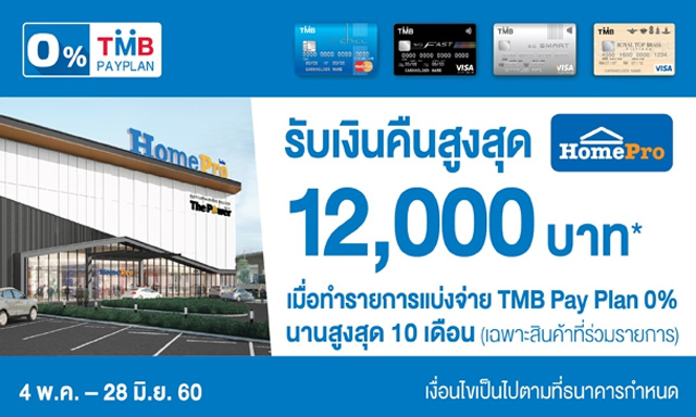 รับเงินคืนสูงสุด 12,000 บาท เมื่อทำรายการแบ่งจ่าย TMB Pay Plan 0% นานสูงสุด 10 เดือน (เฉพาะสินค้าที่ร่วมรายการ) ที่โฮมโปร ทุกสาขา ผ่าน