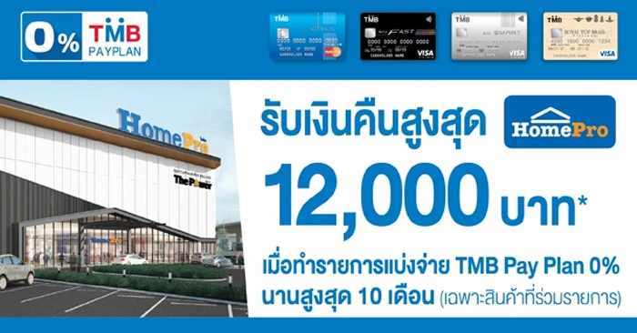 รับเงินคืนสูงสุด 12,000 บาท เมื่อแบ่งจ่าย TMB Pay Plan 0% นาน 10 เดือน ที่ Homepro ผ่านบัตรฯ TMB