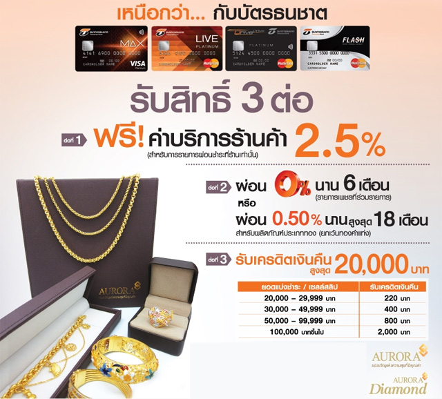 ผ่อนทอง 0% ฟรีค่าบริการ 2.5% พร้อมรับเงินคืนสูงสุด 20,000 บาท ณ ห้างทองออโรร่า จากบัตรฯ ธนชาต