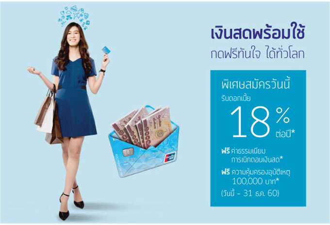 • อัตราดอกเบี้ย 18% ต่อปี เฉพาะลูกค้าใหม่ที่ได้รับการอนุมัติบัตรภายในวันที่ 11 พ.ค. - 31 ธ.ค. 60 เท่านั้น
