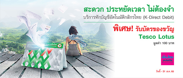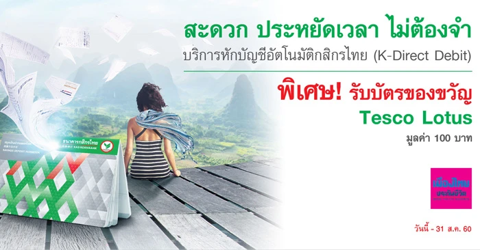 พิเศษสุดๆ เมื่อสมัครบริการหักบัญชีอัตโนมัติกสิกรไทย (K-Direct Debit) เพื่อชำระค่าเบี้ยเมืองไทยประกันชีวิต รับบัตรของขวัญ Tesco Lotus มูลค่า 100 บาท สมัครง่ายๆ ผ่าน สาขาของธนาคารกสิกรไทย K-ATM K-Cyber หรือ ตัวแทนของ บมจ.เมืองไทยประกันชีวิต
