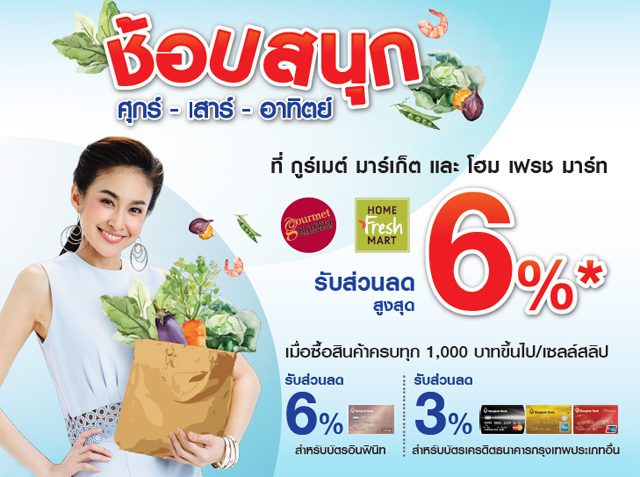 ช้อปสนุก ศุกร์ เสาร์ อาทิตย์ รับส่วนลดสูงสุด 6% เมื่อซื้อสินค้าครบทุก 1,000 บาทขึ้นไป/ เซลล์สลิป ที่กูร์เมต์ มาร์เก็ต และ โฮม เฟรช มาร์ท สิทธิพิเศษสำหรับบัตรเครดิตธนาคารกรุงเทพ