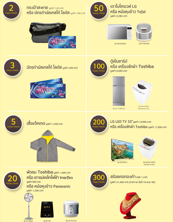 - การขอแลกรับกระเป๋าสะพาย / เสื้อแจ๊คเกต ต้องทำการแลกรับที่สาขาหรือสำนักงาน แลกเปลี่ยนเงินของธนาคารที่ร่วมรายการ