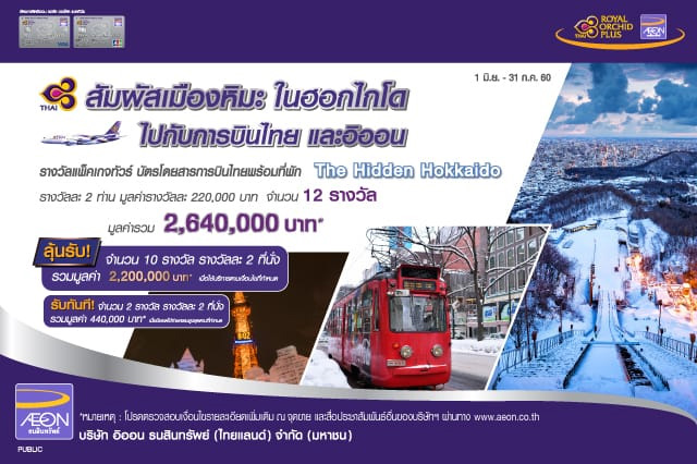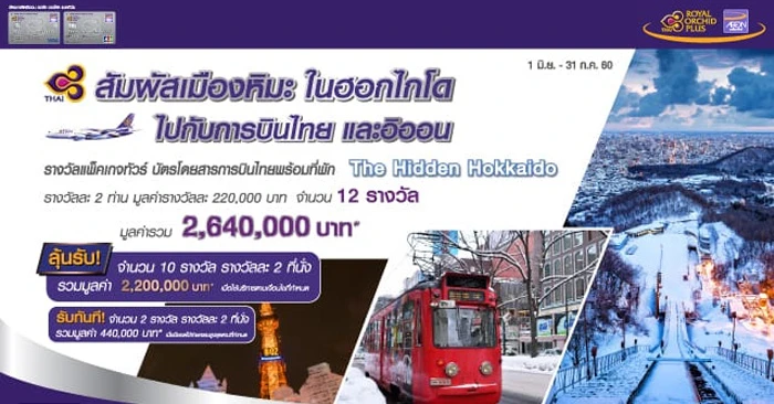 สัมผัสเมืองหิมะในฮอกไกโด ไปกับการบินไทยและอิออน ลุ้นรับแพ็คเกจทัวร์ญี่ปุ่น บัตรโดยสารสายการบินไทยพร้อมห้องพัก (The Hidden Hokkaido) รวมมูลค่าของรางวัลกว่า 2 ล้านบาท เมื่อมียอดใช้จ่ายสะสมผ่าน