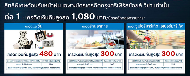 บัตรเครดิตกรุงศรีเฟิร์สช้อยส์ วีซ่า ต่อที่ 1 : เครดิตเงินคืนสูงสุด 1,080 บาท/ บัตรหลักตลอดรายการ