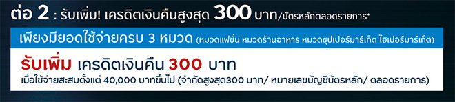 ต่อที่ 2 : รับเพิ่ม! เครดิตเงินคืนสูงสุด 300 บาท/ บัตรหลักตลอดรายการ