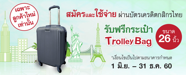 รับฟรี กระเป๋า Trolley Bag มูลค่า 5,990 บาท เมื่อสมัครและใช้จ่ายผ่านบัตรเครดิตกสิกรไทย