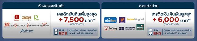 | ครบทุก 7,000 บาท | 120 บาท | 7,500 บาท (ตลอดรายการ) พิมพ์ : ECB (วรรค) ตามด้วยหมายเลขบัตร 16 หลัก ส่งไปที่ 4268800 | รับเครดิตเงินคืน + 1,500 บาท (ตลอดรายการ) |