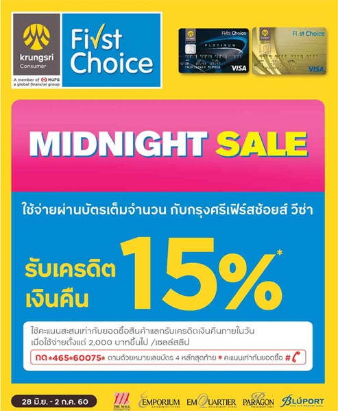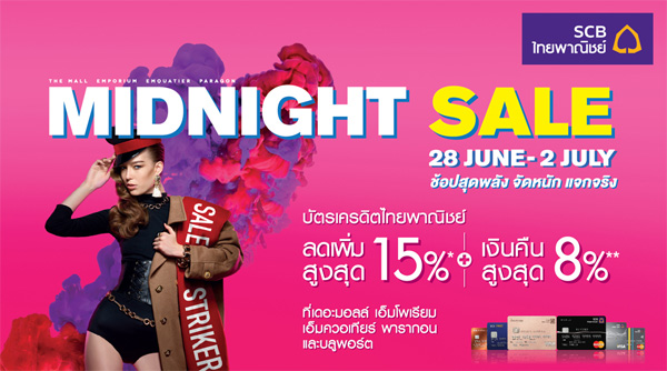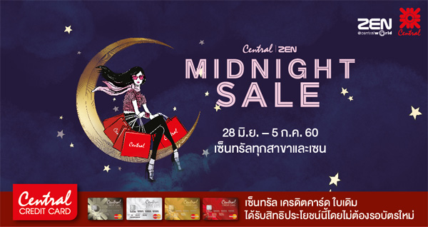 จัดขึ้นแล้ววันนี้! กับงาน MIDNIGHT SALE 2017 ที่บัตรเครดิตชั้นนำ ได้ร่วมจัดโปรโมชั่น ณ ห้างสรรพสินค้าที่ร่วมรายการ อาทิ เซ็นทรัลทุกสาขาและเซน เดอะมอลล์ เอ็มโพเรียม เอ็มควอเทียร์ พารากอน และบลูพอร์ต หัวหิน โดยผู้ถือบัตรจะได้รับทั้งส่วนลดและเครดิตเงินคืนมากมาย ระยะเวลาโปรโมชั่นของแต่ละห้างฯ จะแตกต่างกันไป โดยที่เครือเดอะมอลล์จะสิ้นสุดในวันที่ 2 ก.ค. 60 ส่วนในเครือเซ็นทรัลจะสิ้นสุดในวันที่ 5 ก.ค. 60 นี้ รีบๆ ไปดูโปรโมชั่นกันดีกว่าค่ะ