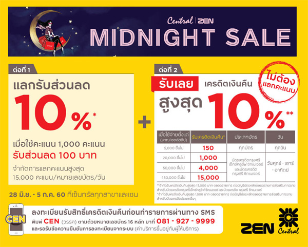 รายละเอียดโปรโมชั่น 2 : รับเงินคืนสูงสุด 3,000 บาท เพียงสะสมยอดช้อปที่เซ็นทรัลทุกสาขาและเซน ในงาน Central Midnight Sale (สูงสุด 3,000 บาท/ บัตร ตลอดรายการ)