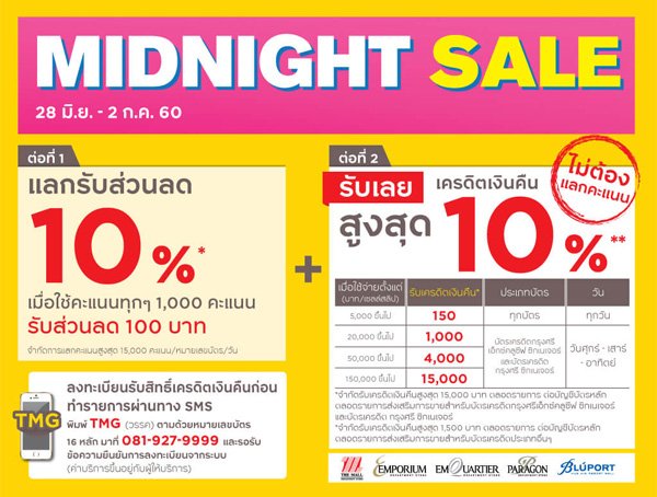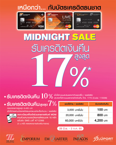 รายละเอียดโปรโมชั่น 1 : MIDNIGHT SALE รับเครดิตเงินคืนสูงสุด 17% เมื่อช้อปที่เดอะมอลล์ทุกสาขา, เอ็มโพเรียม, เอ็มควอเทียร์, พารากอน และบลูพอร์ต